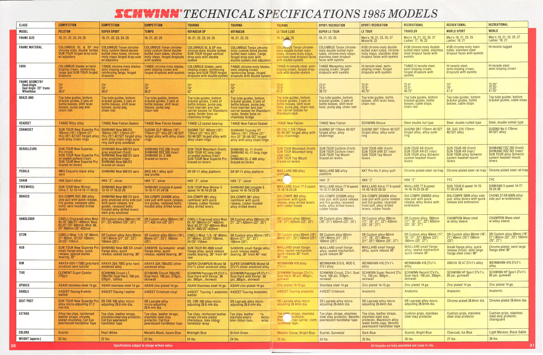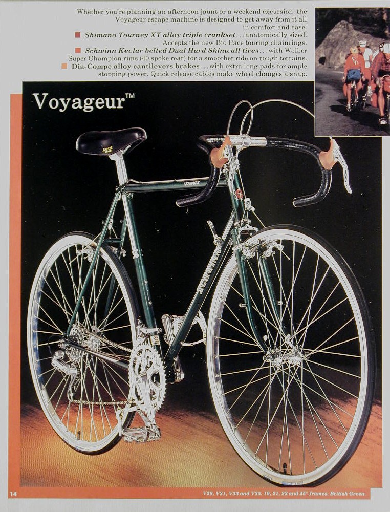 I am the proud owner of a 1985 mint condition Schwinn Voyageur. He bike has been house keep its entire life. I just finished a complete overhaul of the bike. All new bearings, new cables, bar tape, new tires and the rest original from 1985. This bike looks awesome. I only wish I could be restored back to what I looked like in 85. In addition to the restore, the project brought back great memories of when I toured.