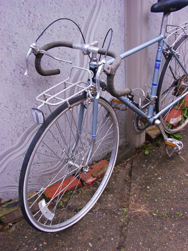 The 700c rim with a 622mm x 32mm Schwalbe Marathon fit well with the medium Honjos and the canti brakes took only a little adjustment before they braked well. (They were much easier to readjust to a 700c rim than my 86 Voyageur.) The bike now has a LED lamp and dynamo hub working. The rear is still a 27 inch for now.