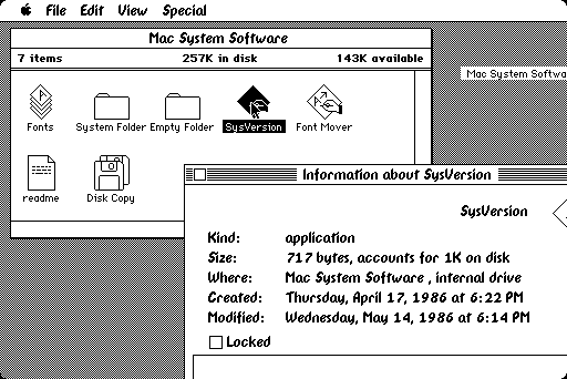 That early in the Macintosh era, there were no official version numbers on the system disks, but the System and Finder files each had their own version number. Various accounts indicate that I’m looking for System 0.97/Finder 1.0. After a lot of searching I’ve turned up several candidate disk images, but each seems to have been modified over time. Here’s one very common version:
